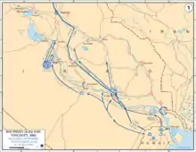 The 2003 invasion of Iraq[lower-alpha 2] was a United States-led invasion of the Republic of Iraq and the first stage of the Iraq War. The invasion phase began on 19 March 2003 (air) and 20 March 2003 (ground) and lasted just over one month,[23] including 26 days of major combat operations, in which a combined force of troops from the United States, the United Kingdom, Australia and Poland invaded Iraq. Twenty-two days after the first day of the invasion, the capital city of Baghdad was captured by Coalition forces on 9 April 2003 after the six-day-long Battle of Baghdad. This early stage of the war formally ended on 1 May 2003 when U.S. President George W. Bush declared the "end of major combat operations" in his Mission Accomplished speech,[24] after which the Coalition Provisional Authority (CPA) was established as the first of several successive transitional governments leading up to the first Iraqi parliamentary election in January 2005. U.S. military forces later remained in Iraq until the withdrawal in 2011.[25]