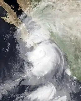 A tropical wave spawned a distinct area of disturbed weather just south of Manzanillo on August 20. It moved northwest and became Tropical Depression Nine-E off Cabo Corrientes by 12:00 UTC on August 22 while it was located about 220 mi (350 km) southeast of Baja California Sur. Under the influence of favorable atmospheric conditions, the cyclone steadily strengthened and obtained tropical storm status on August 23. Early on August 24, Ignacio attained hurricane strength,[30] marking the latest formation of the first hurricane of a season recorded in the East Pacific since reliable satellite observation began in 1966.[31] Ignacio reached its peak intensity on August 26 as a Category 2 hurricane with winds of 105 mph (169 km/h). The storm tracked northwest across the southern Gulf of California and began to weaken due to land interaction, ultimately making landfall with winds of 80 mph (130 km/h) just to the east of La Paz. Ignacio weakened once inland and dissipated early on August 28 over central Baja California.[30]