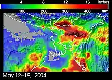 Damage was heaviest in Myanmar where the storm moved ashore, and winds of 157 km/h (98 mph) were reported.[1] Widespread areas reported winds of 40 km/h (25 mph).[7] The Tropical Rainfall Measuring Mission estimated that up to 500 mm (20 in) of precipitation fell along the Bay of Bengal coast in Myanmar and Bangladesh.[8] There were reports of waves 15 m (49 ft) in height along the coast.[9] A high storm surge and coastal flooding inundated four towns in Rakhine State, causing damage to water systems.[10] Flooding was visible on satellite imagery in the days following the cyclone.[11] Eight townships in the state were affected, five of them severely.[12]