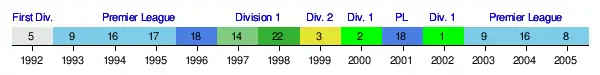 Prior to this season, the history of Manchester City's performance in the English football league hierarchy since the creation of the Premier League in 1992 is summarised by the following timeline chart – which commences with the last season (1991–92) of the old Football League First Division (from which the Premier League was formed).