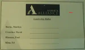 The Alberta Alliance Party, a conservative political party in Alberta, Canada, held its second leadership election on November 18 and 19, 2005, in Red Deer, Alberta. The leadership position was vacated by Alberta Alliance Party founder and leader Randy Thorsteinson in March 2005.