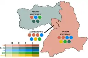 ![]() 2005 Antrim Council Election Results, shaded by plurality of First Preference Votes. | ||||||||||||||||||||||||||||||||||||||||||||||||||||||