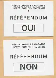 The French referendum on the Treaty establishing a Constitution for Europe was held on 29 May 2005 to decide whether France should ratify the proposed Constitution of the European Union. The result was a victory for the "No" campaign, with 55% of voters rejecting the treaty on a turnout of 69%.