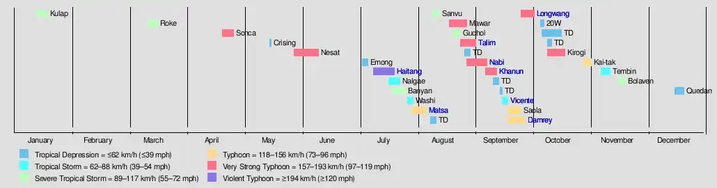 | Talim | Nabi | Khanun | Vicente | Saola | Damrey | Longwang | Kirogi | Kai-tak | Tembin | Bolaven |