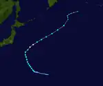 On January 12, a tropical disturbance developed within an area of light vertical wind shear. This allowed deep convection to develop over a broad low-level circulation. The next day, the Joint Typhoon Warning Center (JTWC) issued a Tropical Cyclone Formation Alert (TCFA) as the system continued to develop. Later that day, they issued their first advisory on Tropical Depression 01W while the storm was located about 215 km (134 mi) southwest of Chuuk.[6][7] Several hours later, the Japan Meteorological Agency (JMA) also designated the system as a tropical depression.[8] Early on January 15, the JTWC upgraded 01W to a tropical storm[7] as the system turned towards the north. The northward movement was the result of the system traveling along the edge of a low to mid-level ridge located to the east.[6] About 12 hours later, the JMA upgraded the depression to a tropical storm and gave it the name Kulap;[8] which was contributed by Thailand and is the Thai word for rose.[6] Kulap gradually intensified over the next two days, reaching its peak intensity with winds of 95 km/h (59 mph) 10-minute winds) around 1800 UTC on January 17, making it a severe tropical storm according to the JMA.[8] However, at the same time the JMA assessed Kulap to have reached its peak intensity, the JTWC classified it as a minimal typhoon with winds of 120 km/h (75 mph) 1-minute winds).[7] Shortly after reaching its peak intensity, the storm began to undergo an extratropical transition and weaken.[6] Late on January 18, the JTWC issued their final advisory on Kulap despite the storm remaining tropical.[7] The JMA considered Kulap to have been a tropical storm until early the next day. The storm dissipated as a weak extratropical system around 1200 UTC on January 19.[8] Between January 13 and 14, the storm produced heavy rains over the island of Chuuk. Upwards of 300 mm (12 in) of rain fell during the two-day span, of which 166.6 millimetres (6.56 in) fell in 24 hours.[6]