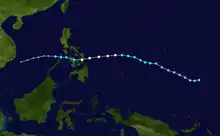 Within the North-western Pacific Ocean, both the Japan Meteorological Agency (JMA) and the Philippine Atmospheric, Geophysical and Astronomical Services Administration assign names to tropical cyclones that develop in the Western Pacific, which can result in a tropical cyclone having two names.[13] The Japan Meteorological Agency's RSMC Tokyo — Typhoon Center assigns international names to tropical cyclones on behalf of the World Meteorological Organization's Typhoon Committee, should they be judged to have 10-minute sustained windspeeds of 65 km/h (40 mph).[14] While the Philippine Atmospheric, Geophysical and Astronomical Services Administration assigns names to tropical cyclones which move into or form as a tropical depression in their area of responsibility located between 135°E and 115°E and between 5°N-25°N even if the cyclone has had an international name assigned to it.[13] The names of significant tropical cyclones are retired, by both PAGASA and the Typhoon Committee.[14] Should the list of names for the Philippine region be exhausted then names will be taken from an auxiliary list of which the first ten are published each season. Unused names are marked in gray.
