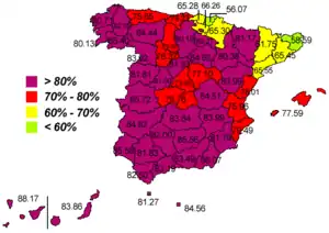 | Valencian Community | 3,457,789 | 44.14 | 1,164,718 | 82.53 | 246,582 | 17.47 | |