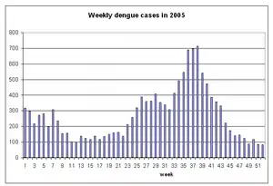 In 2005, there were a total of 14,209 dengue fever cases and 27 people died, a record death toll that would not be surpassed until 2020.[3] The outbreak peaked in the months of September and October, when it caused hospitals to cancel some elective surgery due to the need to allocate more beds for dengue patients.