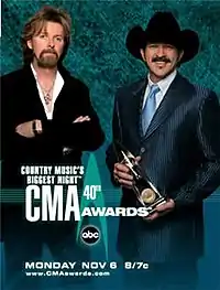 The 2006 Country Music Association Award, 40th Annual Ceremony, took place on November 6, 2006, and was the first ceremony to be held at the Gaylord Entertainment Center (later known as Bridgestone Arena) in Nashville, Tennessee. This was also the first ceremony to be broadcast live from ABC.[1] Brooks & Dunn, and Brad Paisley led with 6 nominations each including Album of the Year, and Entertainer of the Year.
