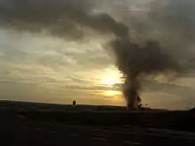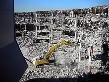 At 08:59 the Renault Trafic went off, destroying much of section D of the parking lot of the airport's newly built Terminal 4 and sending a massive column of smoke into the air. The terminal, designed by Antonio Lamela and Richard Rogers, had been inaugurated just a few months before, on February 5, 2006.[15] According to reports, the van was carrying 500 to 800 kilograms (1,100 to 1,800 lb) of an unknown kind of explosive, probably a mix of ammonium nitrate and hexogen, becoming the third most powerful explosive device ever used by ETA.[16] The explosion demolished almost all of the five floors of the car park and produced around 40,000 tones of debris, with the zone being compared by Spanish authorities to the World Trade Center ground zero,[17] as well as damaging at least 1300 vehicles parked in the terminal. The terminal building was also affected.[16]