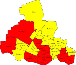 ![]() Map of the results of the 2006 Newcastle council election. Labour in red and the Liberal Democrats in yellow. | |||||||||||||||||||||||||