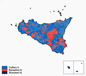 The election was competed by three competitors: Salvatore Cuffaro, incumbent President and House of Freedoms candidate; Rita Borsellino, candidate of The Union; and Nello Musumeci, MEP elected for the National Alliance and now leader of the autonomist movement Sicilian Alliance. In the end, Cuffaro won the election, despite a heavy loss of support compared with five years before, when he was elected with 59.1% of votes.