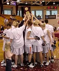 Hope College women's team raises 2006 NCAA Division III championship trophy.