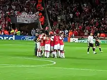 The previous season was a transitional period for Arsenal. The club transferred a number of first-team players such as defenders Sol Campbell and Lauren to Portsmouth and winger Robert Pires to Spanish club Villarreal.[2] After lengthy negotiations, Ashley Cole moved to Chelsea on the final day of the summer transfer window, in exchange for £5 million and defender William Gallas.[3] Arsenal played their home games at the newly constructed Emirates Stadium and drew their first game against Aston Villa.[4] After a defeat by Bolton Wanderers, manager Arsène Wenger admitted that his team were unlikely to make a serious challenge for the Premier League.[5] Despite being a young and inexperienced team, however, Arsenal reached the final of the League Cup, where they were beaten 2–1 by Chelsea.[6] Elimination in the UEFA Champions League in the knockout stage (two-legged matches played home and away) and FA Cup in the space of four days followed – the club lost three games in succession for the first time since October 2002.[7] Arsenal eventually finished fourth in the league, level on points with third-placed Liverpool.[8]