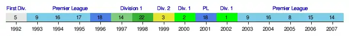 Prior to this season, the history of Manchester City's performance in the English football league hierarchy since the creation of the Premier League in 1992 is summarised by the following timeline chart – which commences with the last season (1991–92) of the old Football League First Division (from which the Premier League was formed).