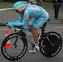 Astana was one of 21 teams invited to the Tour de France. Vinokourov and Klöden were the squad's co-captains, with Kashechkin their main lieutenant and prepared to be a protected rider should either or both of them falter.[52] Vinokourov and Klöden showed well in the prologue time trial, with Klöden second and thus the wearer of the green jersey in Stage 1, with Vinokourov seventh.[53] Klöden stayed out of trouble in Stages 1 through 6, which all featured sprint finishes, but Vinokourov first fell from the top ten due to time bonuses obtained by sprinters and then when he lost over a minute in Stage 5, crashing before the final climb.[54] The high mountain Stages 7 and 8 saw Klöden fall as well, first as a breakaway in Stage 7 was afforded enough time to shake up the top ten[55] and then as Vinokourov and Klöden were both over four minutes off the winning pace of Michael Rasmussen in Stage 8. This stage, however, saw the rise of Kashechkin to fifth overall.[56] In the next stage, after the first rest day, Klöden rebounded with a 9th-place finish to return to the top ten, at seventh overall. Vinokourov was, at this point, 21st.[57]