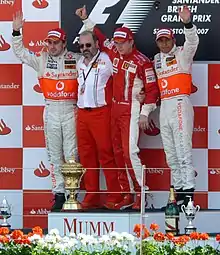 The 2007 British Grand Prix (formally the 2007 Formula 1 Santander British Grand Prix) was the ninth race of the 2007 FIA Formula One World Championship. It was held on 8 July 2007 at the Silverstone Circuit.[2] The race was won by Kimi Räikkönen after overtaking pole position driver Lewis Hamilton during the first round of pit stops.[3] Second place was taken by Fernando Alonso and Hamilton was third.