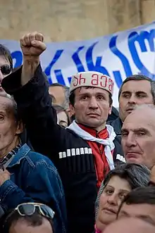 In 2007, a series of anti-government protests took place across Georgia. The demonstrations peaked on 2 November 2007, when 40,000–50,000[1] rallied in downtown Tbilisi, the capital of Georgia.[2] People protested against the allegedly corrupt government of president Mikheil Saakashvili. Protests triggered by detention of Georgian politician Irakli Okruashvili on charges of extortion, money laundering, and abuse of office during his tenure as defense minister of the country[3] were organized by the National Council, an ad hoc coalition of ten opposition parties, and financed by the media tycoon Badri Patarkatsishvili.[4] Demonstrations occurred both in September and November 2007 and were initially largely peaceful. The protests went downhill by 6 November 2007, but turned violent the next day when the police, using heavy-handed tactics, including tear gas and water cannon, unblocked Rustaveli Avenue, Tbilisi's main boulevard, dislodged the protesters from the territory adjoining to the House of Parliament, and prevented the demonstrators from resuming the protests. The government accused the Russian secret services of being involved in an attempted coup d'état and declared a nationwide state of emergency later that day which lasted until 16 November 2007.