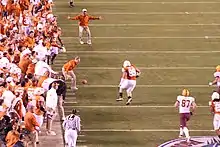 The controversial penalty was a big break for ASU as it resulted in a large momentum shift in allowing the Sun Devils to score.[20][30] Video replays did show several Longhorns were on the field along with Jessee, despite an earlier bench warning that was given to Texas.[25][31] For his role in inadvertently penalizing his team, Jessee has been compared to Steve Bartman, the man who may have inadvertently hurt the World Series prospects of the Chicago Cubs by interfering with a ball still in play. Unlike Bartman, Jessee's goof did not result in a loss for his team; the Longhorns were able to shrug off the setback.[24][25] Commentators also joked that Jessee might star in the Southwest Airlines advertising campaign called wanna get away? which includes people in difficult or uncomfortable positions longing to leave town.[30][32]