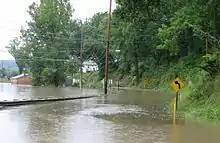 Southeast Minnesota and southwestern Wisconsin are in the Driftless Area, which was not covered by the last glaciation, and therefore is not covered by deep layers of glacial till. The soils therefore are thin and less able to retain water; they lie atop porous rock into and through which surface waters can rapidly drain into the water table.[37] The highly dissected topography, characterized by steep hills and bluffs and deep coulees, gives steep gradients to the drainage and makes streams highly erosive. As the rains far exceeded the absorption rate of 1.5 inches (3.8 cm) in six hours, flash floods rapidly overflowed the water courses and spread across the valley floors.[38][39] The towns of Stockton, Houston, Elba, Minnesota City, and portions of Winona, on the Mississippi River, were evacuated. Citizens were moved to Saint Mary's University in Winona, Lewiston, and Caledonia, Minnesota. Massive bluffs gave way in Brownsville and several homes were completely washed away. Governor Tim Pawlenty ordered 240 National Guard soldiers to help and declared a state of emergency in six counties. The Minnesota Army National Guard soldiers guarded communities that were cleared out after the flooding early August 19. The Army Corps of Engineers opened up the floodgates on the rising Root River to release some of the water creating pressure on the dike in Houston.[40]