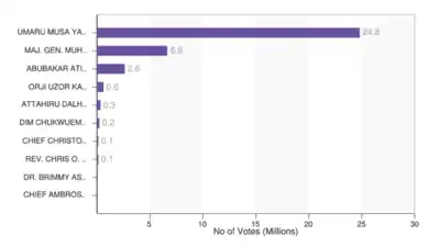 The first results to be released, from Rivers State, showed a large majority for Yar'Adua.[29][26] On April 23, Yar'Adua was declared the winner by INEC, which said that he had received 70% of the vote[30] (24,638,063 votes).[31] Buhari was in second place with 18% of the vote[30] (6,605,299 votes),[31] while Abubakar was placed third with about 7%[30] (2,637,848 votes).[31] Both Buhari and Abubakar rejected the results. The opposition candidates believe the election was rigged in Yar'Adua's favor.[30]