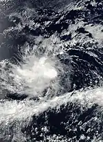 A tropical wave emerged off the western coast of Africa on July 16. Tracking westward, intermittent bursts of deep convection occurred as it crossed the Leeward Islands on July 22, but associated activity remained disorganized. The wave crossed Central America three days later, emerging into the eastern Pacific Ocean shortly thereafter. On July 28, a broad area of low pressure formed along the wave axis; easterly shear, however, prevented thunderstorms from developing over the center. Convective activity increased by July 31, leading to the formation of a tropical depression at 1200 UTC that day.[38] Despite the unfavorable environment, satellite intensity estimates increased to tropical storm intensity, prompting the National Hurricane Center to upgrade the depression to such.[39] After attained a peak intensity with winds of 40 mph (65 km/h) and a minimum barometric pressure of 1004 mb (hPa; 29.65 inHg) at 0600 UTC on August 1, continued wind shear caused Erick to weaken to a tropical depression. The low-level center became lost organization as it became elongated northeast to southwest on August 2, leading to degeneration into a tropical wave by 0600 UTC. The remnants of the system dissipated six hours later.[38]