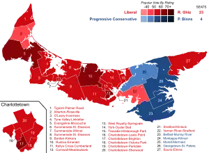 ![]() Popular vote by riding. As this is an FPTP election, seat totals are not determined by popular vote, but instead via plurality results by each riding. | ||||||||||||||||||||||||||||||||||