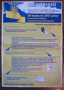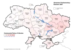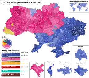 Early parliamentary elections were held in Ukraine on 30 September 2007. The election date was determined following agreement between the President Viktor Yushchenko, the Prime Minister Viktor Yanukovych and the Chairman of the Verkhovna Rada (Ukrainian Parliament) Oleksandr Moroz on 27 May 2007, in an attempt to resolve the political crisis in Ukraine triggered by the 2 April 2007 presidential decree on dissolution of Ukraine's parliament.[1][2]