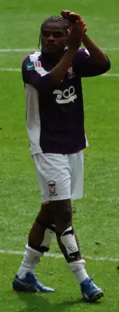 After the season ended, York released Greaves, Hogg, McBreen, Pejic, Radcliffe, Robinson, Rusk, Shepherd, Christian Smith and Wilkinson.[139][140][141][142] Boyes, Farrell, Darren Kelly and Sodje left for Scunthorpe, Rushden, Portadown and Barnsley respectively.[143][144][145][146] Brodie, McWilliams, Mimms and Purkiss signed new contracts with the club.[139][140][147] Over the summer York signed defenders James Meredith from Shrewsbury Town,[148] Alan O'Hare from Mansfield[149] and Djoumin Sangaré from Salisbury,[150] midfielders Neil Barrett from Ebbsfleet,[151] Andy Ferrell from Kidderminster,[147] Alex Lawless from Forest Green,[152] Mackin from Wrexham,[148] winger Craig Nelthorpe from Oxford,[147] and strikers Michael Gash from Ebbsfleet,[153] Richard Pacquette from Maidenhead United[148] and Michael Rankine from Rushden.[144] Striker Michael Emmerson was promoted from the youth team after he signed a professional contract with the club.[154]