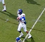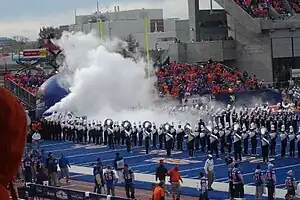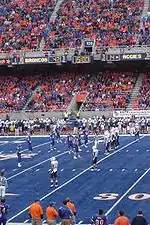 The 2008 Boise State Broncos football team represented Boise State University in the 2008 NCAA Division I FBS football season. The Broncos played their home games at Bronco Stadium, most famous for its blue artificial turf surface, often referred to as the "smurf-turf". The blue turf was new for the 2008 season, as the old Astroplay surface was replaced by Field Turf. The Broncos won the Western Athletic Conference championship and were one of only two teams (the other being the Utah Utes) to finish the 2008 regular season with an undefeated record. However, the Broncos were unable to finish the season undefeated after losing 17–16 to #11 TCU in the Poinsettia Bowl.