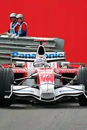Massa retained his pole position lead into the first corner, followed by Trulli, Räikkönen, Hamilton and Kovalainen. Coulthard was hit from behind by Nico Rosberg into turn two, spinning him around. The Red Bull car then collided with Rosberg's Williams teammate Kazuki Nakajima. This damaged the suspension and forced Coulthard to retire in his final race.[30][31][32] Piquet spun off at the next corner, his car hitting the barriers. Kovalainen was passed by Alonso and Vettel mid-lap, dropping him to seventh.[26] The accidents of Coulthard and Piquet prompted the deployment of the safety car at the end of the first lap. The track conditions began to dry early on; Force India's Giancarlo Fisichella was the first driver to stop for dry-weather tyres, pitting at the end of lap two. He remained in 18th position.[33][34] Racing resumed on lap five when the safety car pulled into the pit-lane.[29] Rosberg and Button both made pit stops on lap seven, each changing to dry-weather tyres. Bourdais, Glock, Adrian Sutil and Nakajima followed a lap later. By lap 11, the rest of the field had changed to dry-weather tyres.[26][35] Fisichella benefited from pitting the earliest for dry tyres, moving up the order to a high of fifth position.[33]
