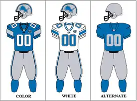 To celebrate their 75th season playing as the Lions,[note 2] the team wore a special throwback replica of the uniforms used in 1934, their first season as the Lions, for two home games. The uniforms had blue jerseys with silver lettering, solid silver pants, blue socks, and solid silver helmets (as helmets were leather back then). This replaced their black alternate jersey used in the 2005 to 2007 seasons.