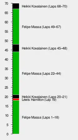 Massa, Kubica and Webber were the first three drivers to make pit stops by coming in on lap 18.[1] The McLaren mechanics timed Massa's stop to estimate the amount of fuel he received, and when Hamilton made his own first stop on the next lap, they fuelled him to run for three laps longer than the Ferrari in the second stint of the race.[22] Kovalainen took over the lead of the race for two laps before his pit stop on lap 21 returned it to Massa.[1] Piquet was the last of the leading runners to make a pit stop, on lap 25, allowing him to jump ahead of Kubica, Trulli and Webber.[23] Further down the order, Vettel made an unscheduled pit stop on lap 20 and retired two laps later with an overheating engine.[1][15] By the end of lap 26, all of the leading drivers on two-stop strategies had taken their pit stops. The race order was Massa leading from Hamilton, Kovalainen, Glock, Coulthard (who was yet to pit), Alonso, Räikkönen, Piquet, Trulli, Kubica, Webber, Heidfeld, Button, Barrichello, Bourdais, Rosberg, Nakajima, Fisichella and Sutil.[1]