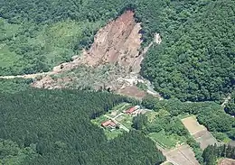 Landslides triggered by this earthquake crushed structures, buried people, cut off access to certain roads, and isolated some rural communities.[11] Mud from landslides dammed up rivers to form lakes called "quake lakes" (せき止め湖, sekitomeko).[12]