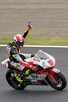 Marco Simoncelli, waving at the crowd after winning the 250cc race.