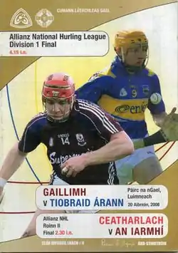 The 2008 National Hurling League, known for sponsorship reasons as the Allianz National Hurling League, was the 77th edition of the National Hurling League (NHL), an annual hurling competition for the GAA county teams. Tipperary won the league, beating Galway in the final.[1][2][3] The tournament saw the first appearance of Fingal and South Down as "county" teams in the NHL.