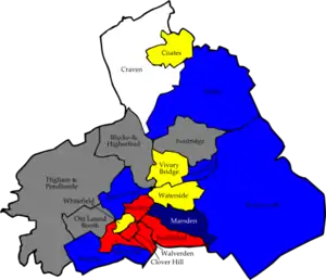 The results saw the Liberal Democrats lost their majority on the council after suffering a net loss of 8 seats.[10] Defeated councillors for the Liberal Democrats included the leader of the council Alan Davies in Boulsworth, Nelson Committee chairman David Foster in Clover Hill, Shelley Franklin in Craven, Frank Wren in Brierfield and Judith Robinson in Southfield.[11] The Liberal Democrats blamed their defeats on a targeted campaign by the Conservatives, while the Conservatives said the "tide is now turning towards us".[12]