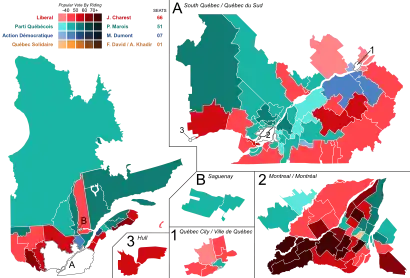 ![]() Popular vote by riding. As this is an FPTP election, seat totals are not determined by popular vote, but instead via results by each riding. Click the map for more details. | |||||||||||||||||||||||||||||||||||||||||||||||||||||||||||||||||||||||