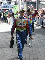 The event started with a short superspecial stage on Thursday evening - which was won by Sébastien Loeb - before the first full day of action on Friday. The first stage on Friday demonstrated the competitive nature of the rally, with Loeb and Hirvonen setting identical times, and Jari-Matti Latvala only finishing three seconds behind them. However, Latvala was the first big casualty, hitting a rock on SS3 and damaging the suspension - an accident that put him out for the day and angered his Ford team boss Malcolm Wilson (rally).[2] Meanwhile, Loeb was eking out a narrow advantage by winning every special stage until SS8. Hirvonen was also driving flat out and matched Loeb's time on SS6 and took his first outright stage win on the 7.86 mile test at Urria. At the end of day one, Loeb had built up a useful lead of 14.4 seconds, although Hirvonen had not given up hope. Behind the two leaders saw a three way battle between the two Stobart Ford drivers, Henning Solberg and Gigi Galli, and Loeb's teammate Dani Sordo. These three were covered by only twelve seconds. The two Subaru World Rally Team drivers, Petter Solberg and Chris Atkinson were having their own private battle, just over ninety seconds behind the leader. Suzuki's Per-Gunnar Andersson was in the final points paying position despite suffering a huge spin on SS2. Impressive performances were made by privateers Urmo Aava and Andreas Mikkelsen, with both featuring in the points earlier on day one - Aava was third after SS4 with Mikkelsen in fifth.[3] However they both crashed out near the end of day one - Aava in SS9 and Mikkelsen in SS10.[4]
