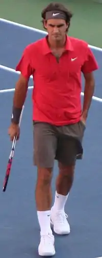 At the Summer Olympics in Beijing, Federer lost in the quarterfinals to James Blake for the first time in their nine matches.[11] Federer however, finally won his first Olympic gold medal in the men's doubles, when he and compatriot Stanislas Wawrinka upset the world no. 1 doubles team of Bob and Mike Bryan of the United States in the semifinals and defeated Sweden's Simon Aspelin and Thomas Johansson in the final, 6–3, 6–4, 6–7, 6–3. The following day, Federer lost his world no. 1 ranking to Nadal after 237 consecutive weeks.[10][12][13]