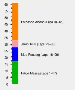 Fernando Alonso credited his success to the team's strategy and bit of luck. He said that the team chose a two-stop strategy with a short initial stint as opposed to a one-stop strategy, considering the difficulties of overtaking on the track and possibility of brake problems.[31] Nico Rosberg was pleased with his career best result,[31] although he recalled when he thought his efforts for a good finish might have been in vain after being given a stop-and-go penalty. He mentioned that he had to come in for the pit stops on the same lap that the safety car came out, and admitted that he was annoyed with the penalty.[32] Hamilton said that he tried to get close to Rosberg towards the final laps, after the second safety car period; however, seeing that overtaking was extremely risky, he decided against it, considering that neither of the Ferraris was going to score.[31]