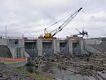 By the morning of August 1, the Tanana River had begun to fall in Fairbanks, just as the Salcha River had begun to recede in Salcha. Though isolated roads continued to wash out from heavy water flow and residents were not allowed to return to their homes, the water level of the river continued to fall.[5] Due to this fact, the opening of Fairbanks' Tanana Valley Fair—scheduled for August 1—was not delayed.[20] Despite the falling water level in the Tanana, the Chena River continued to rise due to the differing water levels in the two rivers. This fact caused the U.S. Army Corps of Engineers to close the floodgates of the Chena River Lakes Flood Control Project at 3:30 a.m. on August 1.[8] They remained closed throughout the day before being reopened at 5:30 a.m. on August 2.[21]