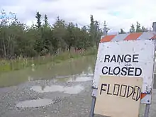 The Tanana River, which is not controlled by the flood project, meanwhile reached a crest of 26.60 feet at Fairbanks on the 30th.[17] This amount was more than two feet above flood stage and was the highest level seen since August 1967, when the river crested at 27.80 feet (8.47 m) during the great 1967 Fairbanks flood.[18] The height of the water caused flooding in the Rosie Creek and Chena Pump neighborhoods west of Fairbanks, and caused some residents to evacuate. Residents who remained were placed under a boil-water order for fear that floodwater had contaminated the public drinking water system.[14] In response to the continuing spread of the flood, Fairbanks and Fairbanks North Star Borough authorities opened an emergency operations center to handle the response to the flood and answer residents' questions.[14] Residents of the Rosie Creek neighborhood were awakened in the early morning hours of the 31st by borough warnings and volunteer firefighters, who instructed them to evacuate. High water had surrounded the residents' homes, causing many to flee to a shelter set up at a nearby elementary school.[15] No residents were injured in the evacuation, something many of them credited to prompt and efficient warnings.[19] The continued high water of the Tanana River caused overflow to flood into the nearby Chena, normally a tributary of the Tanana. Despite that unusual flow, engineers at the Chena River Lakes Flood Control Project decided not to close the project's floodgates, forecasting that the Chena would not rise above flood stage, even with the increased flow.[5]