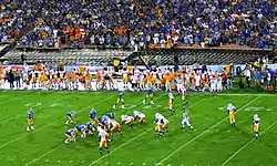 The 2008 Tennessee Volunteers football team represented the University of Tennessee in the 2008 NCAA Division I FBS football season. The team was led by head football coach Phillip Fulmer in his 16th and final season as head coach. The Vols played their home games in Neyland Stadium and competed in the Eastern Division of the Southeastern Conference (SEC). The 2008 campaign followed a 10–4 2007 season, which saw the Vols win the Eastern Division of the conference and the Outback Bowl. This season marked the ten year anniversary of Tennessee's 1998 BCS National Championship. On November 3, Fulmer announced that, after winning some 150 games over his career, he would step down from coaching his alma mater at the end of the season.[1]