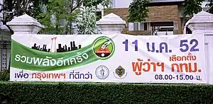 The ninth gubernatorial election for the city of Bangkok, Thailand was held on 11 January 2009.[1] The election came about after the resignation of Apirak Kosayothin on 13 November 2008, the incumbent who was only just re-elected a little more than a month (on 5 October 2008). the resignation stemmed from an indictment by the National Counter Corruption Commission or NCCC, in which Apirak was indicted for the controversial 6.6 billion Baht fire-engine procurement contract. The former Prime Minister and former Bangkok Governor Samak Sundaravej was also found guilty in the same verdict.[2] On 13 November Apirak announced his resignation saying: "Like the Democrat Party, I support a move that will perpetuate politics-for-people" at the same time maintaining his innocence and stating that his resignation should become an example of a change in Thai politics, his resignation triggered an automatic by-election.[3] By the end of the 11 January 2009, Sukhumband was declared the winner of the race, becoming the 15th Governor of Bangkok.[4]