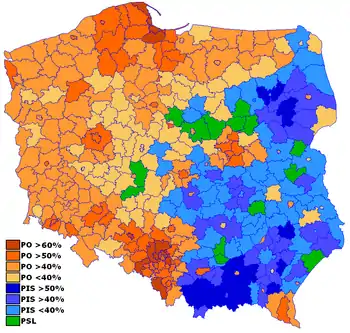As anticipated, the Civic Platform (PO) won a significant victory, winning more than 44% of the vote and gaining half of the total seats. PO's vote was higher than their 41.5% achieved at the 2007 Polish parliamentary election, and to date was the highest vote achieved by a Polish political party to either the Sejm (national legislature) or the European Parliament. Law and Justice (PiS), came second (27.4%), having more than doubled their vote and seats won as compared to the 2004 EU election, but their vote fell, in comparison to the national elections of 2007. PO polled strongest in the western half of Poland, whilst PiS polled best in the eastern half, particularly the south-east.