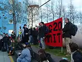 At about 7 pm the police stopped allowing people to enter or leave the protest.[49] The police advanced on protesters who put their hands in the air and passively resisted while chanting "This is not a riot",[50] a tactic that emerged over the course of a number of Camp for Climate Action gatherings.[51] There were scuffles with the police in which several protesters were hit and kicked by the police and one policewoman needed medical attention.[52] Within the cordon people carried on playing music and preparing food and until the police began letting people leave at about 11:30 pm[49] and cleared the area of the last protesters at about 2 am.[48]