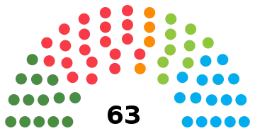 There are six constituencies in Iceland. According to the Law on Parliamentary Elections (nr.24/2000), each constituency is granted 9 seats decided by proportional voting in the constituency, and finally 9 special Leveling seats (either 1 or 2 per constituency, depending on their population size) will work to adjust the result, so that proportionality is also ensured according to the overall number of party votes at the national level. The number of constituency seats shall however be adjusted ahead of the next election, if the fraction of residents with suffrage per available seat in the constituency became more than twice as big in the latest election, when comparing the constituency with the highest fraction against the one with the lowest fraction. In that case a constituency seat shall travel from the constituency with the lowest figure to the one with the highest figure, until the result of the equation comply with the rule. However, the total number of seats (including leveling seats) must never become less than six in any constituency.[23] The box below display the number of available seats in each constituency at the 2009 parliamentary election.[24]