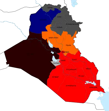 Governorates holding election are green; Kirkuk (blue) and Iraqi Kurdistan (red) postponed their elections for later on the year.