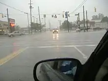 On August 4, 2009, at 9:25 am EDT a major thunderstorm producing large hail and winds in excess of 60 mph (97 km/h) advanced at the leading edge of a cold front moving across the American Midwest, causing a flash flood that struck Louisville and portions of the surrounding Kentuckiana region. The National Weather Service estimated that between three and six inches (7.6 and 15.2 cm) of rain fell across the city in less than one hour, breaking all previous one-hour rainfall records in the area. Most of the downtown area was underwater, with the deluge reaching four feet (1.2 m) deep in places. The flood was the third major disaster to strike the region in less than one year. (Winds from Hurricane Ike knocked out the electrical grid, an ice storm took out the electrical grid, then the flash flood.)